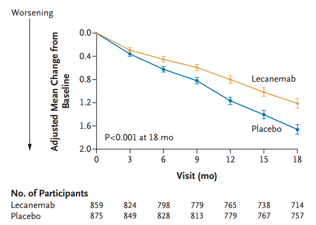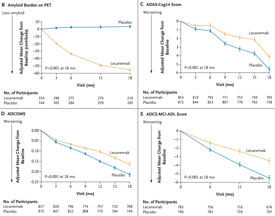Clarity AD是一项为期18个月的多中心双盲3期临床试验,纳入了1795名早期AD患者,即经正电子断层发射断层扫描(PET)或脑脊液证据确诊的AD相关轻度认知障碍或轻度痴呆患者。参与者随机分配至治疗组和安慰剂组,接受10mg/kg/双周静脉注射治疗,主要终点为CDR-SB评分较基线变化,次要终点为PET检测的淀粉样蛋白负荷变化和ADAS-cog14、ADCOMS、ADCS-MCI-ADL量表评分变化。