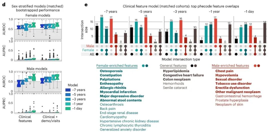 对女性,较早期的预测因子包括呼吸/循环系统特征,AD发病5年前的肌肉骨骼特征,较晚期的感知和精神障碍。男性中,早期内分泌/代谢/循环系统疾病有重要预测意义,随后是消化和泌尿生殖系统疾病,以及晚期的精神障碍。