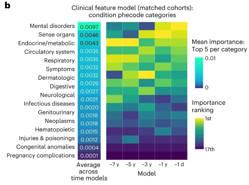 在匹配队列上训练模型,研究者找出了较为重要的AD预测因子,包括健忘等认知问题、高血脂、头晕、白内障、充血性心衰、骨关节炎等。这些预测特征与时间点有关,例如高血脂和充血性心衰在全阶段均有重要的预测能力,骨质疏松、头晕、背痛等在发病前3年作用凸显,而记忆力减退和维生素D缺乏在接近AD发病的时间点才会变得较为重要。