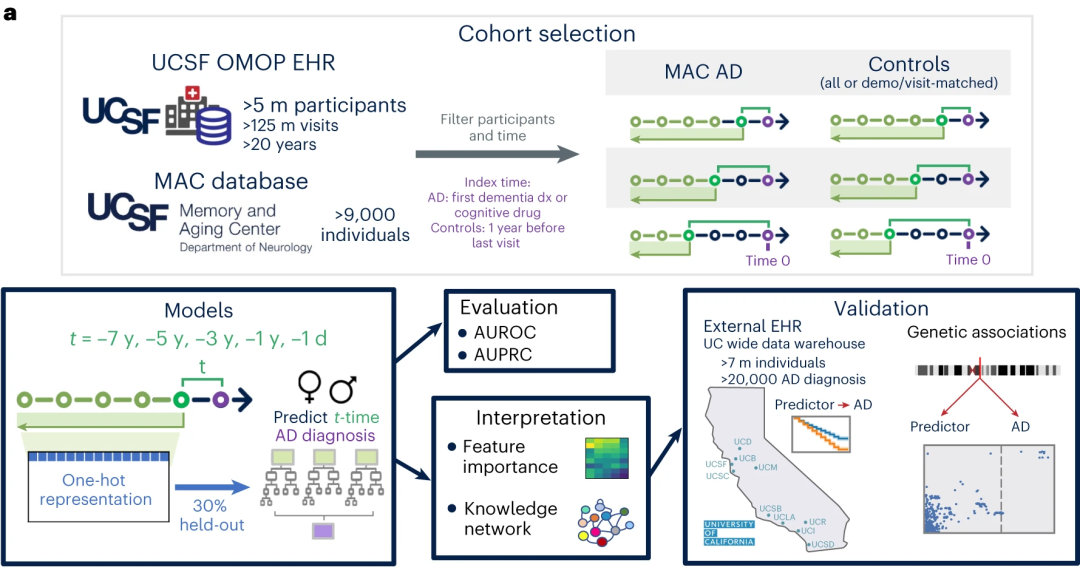 本周,《自然·衰老》杂志发表了来自加州大学洛杉矶分校(UCSF)科学团队的新研究成果,研究者们利用UCSF医学中心的电子健康记录(EHR)数据开发了AD发病的AI预测模型,并从中找出了关键预测因子与AD背后的生物学联系。
