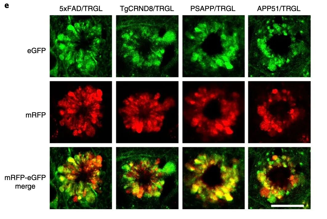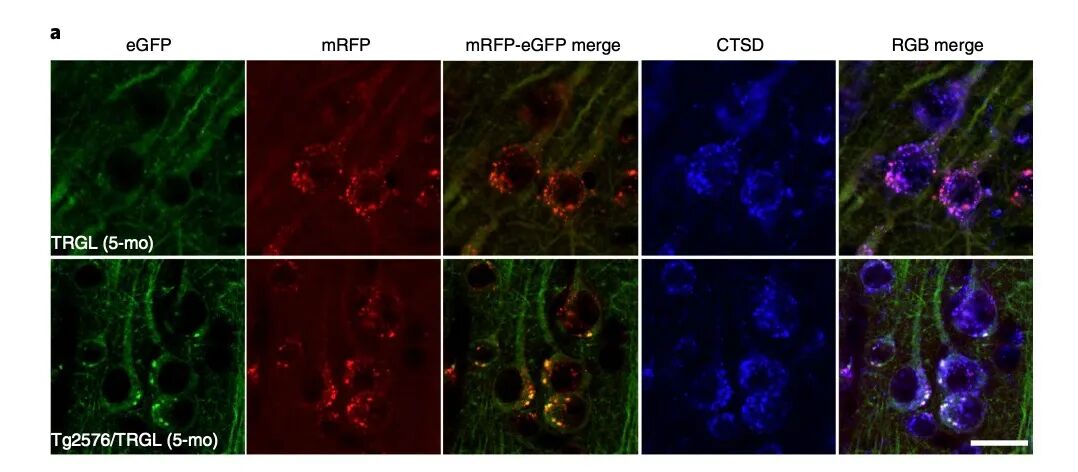 在这项研究中,研究人员培育了一种可以让mRFP-eGFP-LC3在神经元中特异性表达的TRGL小鼠,然后再将TRGL小鼠与AD模型小鼠Tg2576杂交,培育出可以监测自噬进程的AD小鼠模型。使用这个小鼠模型,研究团队得到了以下两个重要的发现。