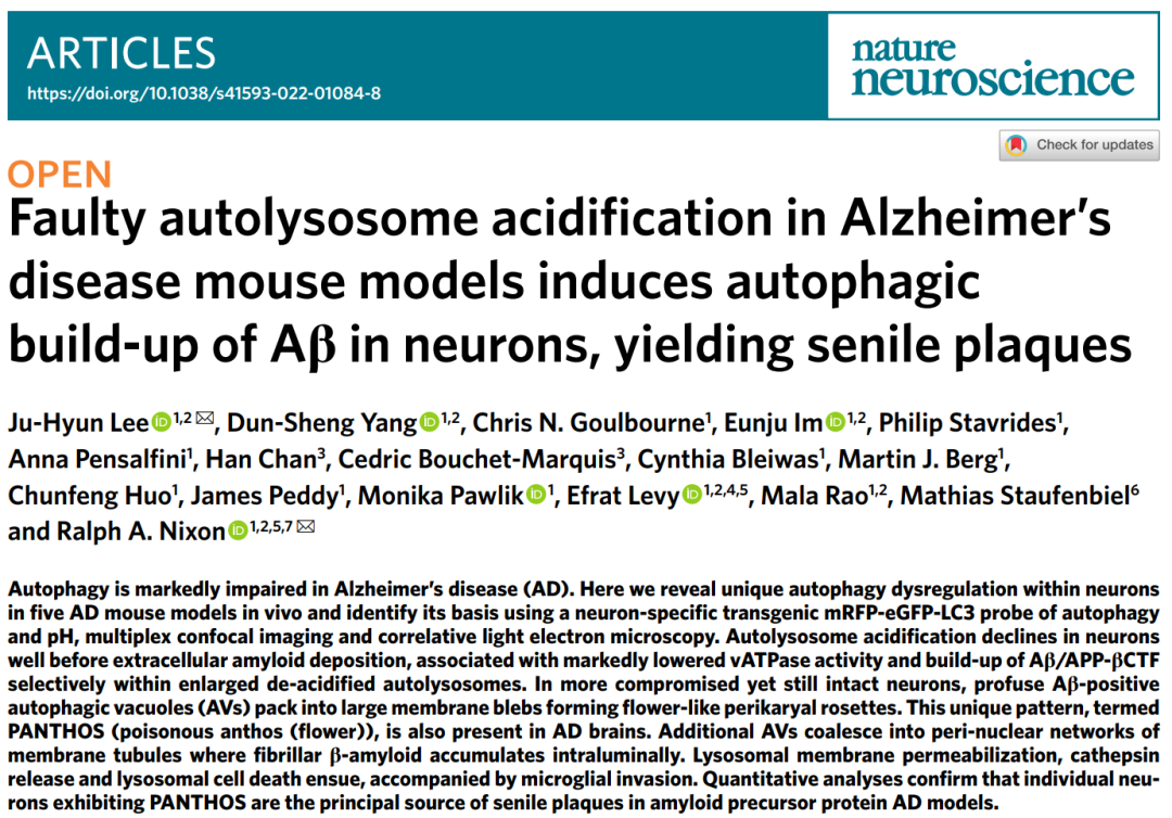 [2]Lee, JH., Yang, DS., Goulbourne, C.N. et al. Faulty autolysosome acidification in Alzheimer’s disease mouse models induces autophagic build-up of Aβ in neurons, yielding senile plaques. Nat Neurosci 25, 688–701 (2022).