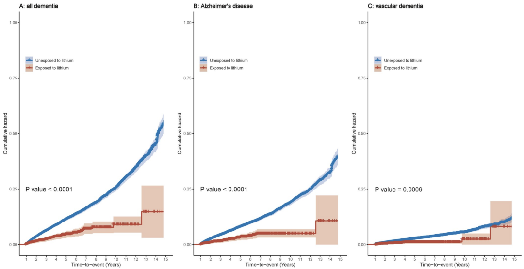 陈善全团队发现,短期和长期使用锂盐(有相关药物)与痴呆症及其亚型的发生风险降低有关。具体来说,锂使用与患痴呆症风险下降44%有关,与患阿尔茨海默病(AD)风险下降45%有关,与患血管性痴呆(VD)的风险下降64%有关。