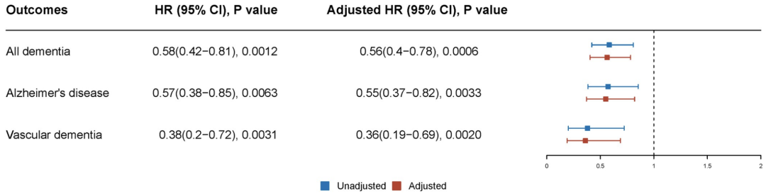 在纳入社会人口统计学因素、吸烟状况、其他药物使用、其他精神合并症以及身体合并症等混杂因素后,研究人员发现,锂使用与痴呆症风险下降44%有关(HR = 0.56,p = 0.0006),与患AD风险下降45%有关(HR = 0.55, p = 0.0033),与患VD的风险下降64%有关(HR = 0.36,p = 0.002)。