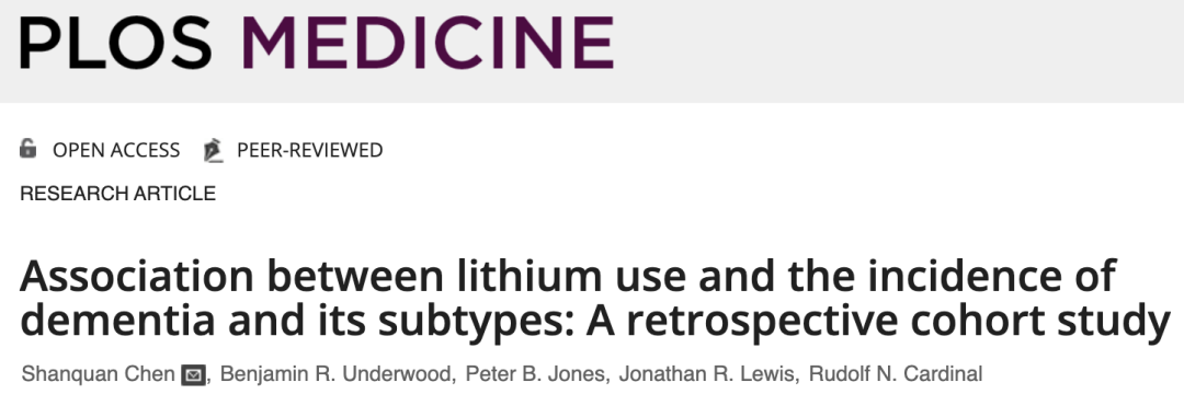 1.Chen S, Underwood BR, Jones PB, et al. Association between lithium use and the incidence of dementia and its subtypes: A retrospective cohort study. PLoS Med. 2022;19(3): e1003941.