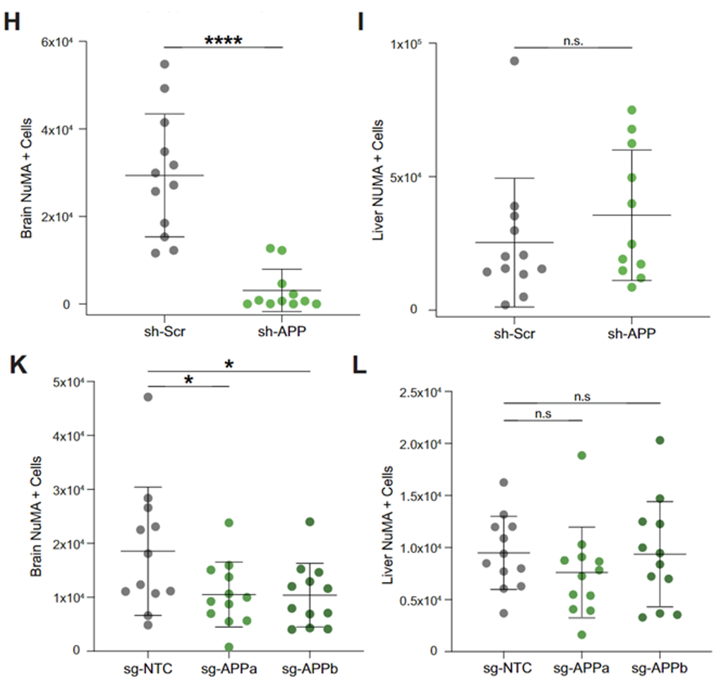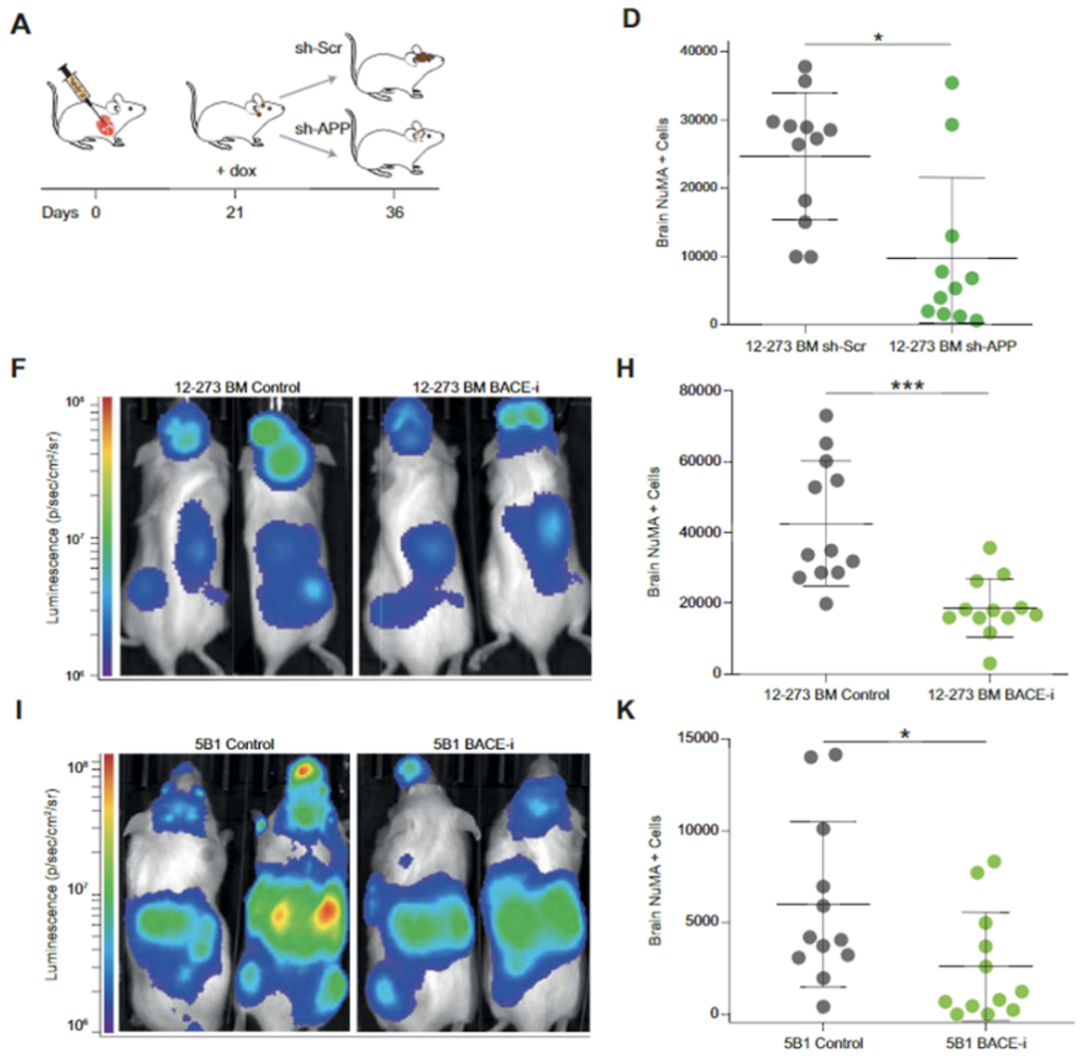 Hernando团队通过诱导性shRNA系统在已经建立的脑转移模型中敲低APP的表达,实验结果显示,即使在已经建立的脑转移瘤中,敲低APP也能够显著降低肿瘤负荷。
