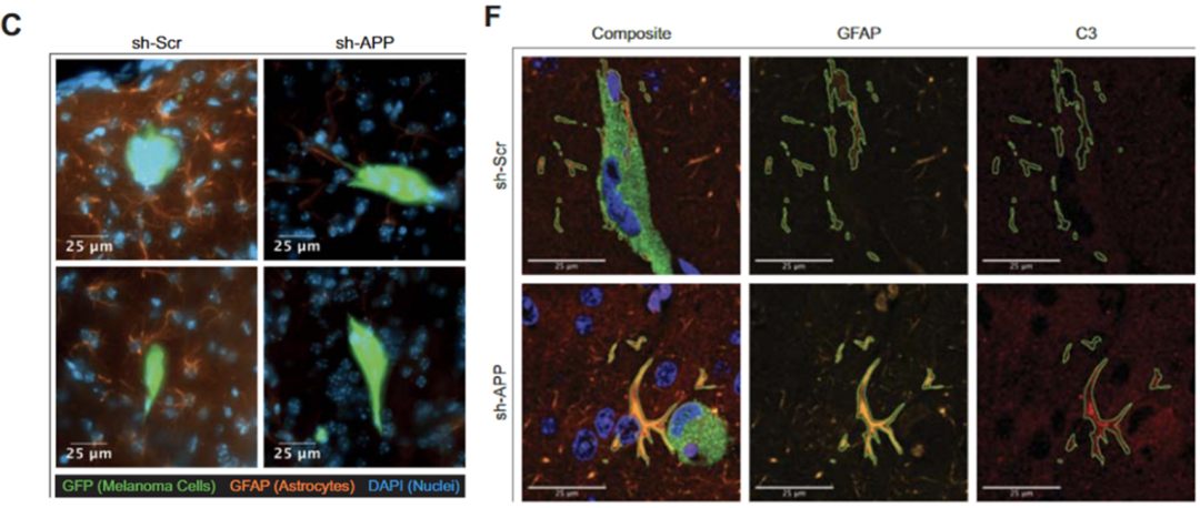 ▲ C:敲低APP后脑转移肿瘤细胞周围形形胶质细胞数量显著减少;F:在Aβ存在的情况下星形胶质细胞的C3表达显著下降