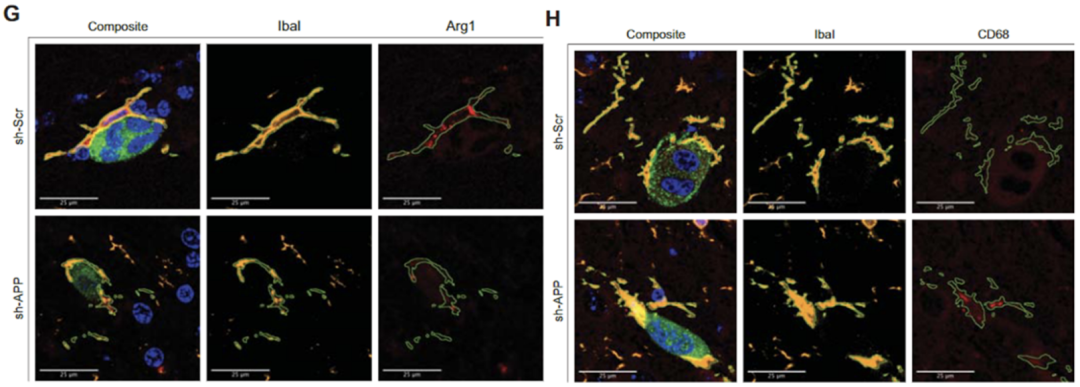 他们通过免疫荧光技术、共聚焦显微镜以及三维成像技术,观察黑色素瘤相关小胶质细胞(Iba1+)的表型,发现在有Aβ的情况下,小胶质细胞表达更多的抗炎介质Arg-1,而吞噬功能标志物CD68的表达则显著下降。