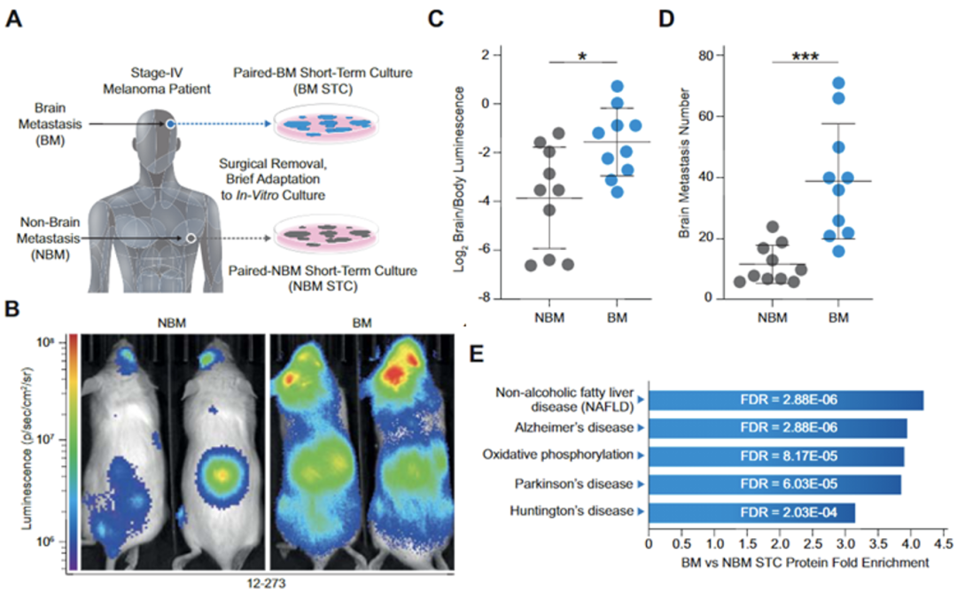 为了寻找脑转移灶肿瘤的特征,Hernando团队将同一个黑色素瘤患者的脑转移灶(BM)和非脑转移灶(NBM)中的肿瘤细胞分离出来,短期培养后使用短期培养物(STC)进行小鼠荷瘤实验,以及无偏差蛋白质组分析。小鼠荷瘤实验显示,脑转移灶来源的肿瘤细胞表现出更强的脑转移能力。这表明脑转移灶的细胞具有独特的能力,能够更好的适应大脑内的环境。
