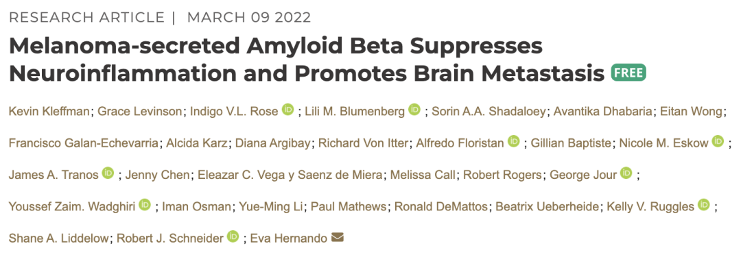 8. Kleffman K, Levinson G, Rose IVL, et al. Melanoma-secreted Amyloid Beta Suppresses Neuroinflammation and Promotes Brain Metastasis [published online ahead of print, 2022 Feb 24]. Cancer Discov. 2022;candisc.1006.2021. doi:10.1158/2159-8290.CD-21-1006.