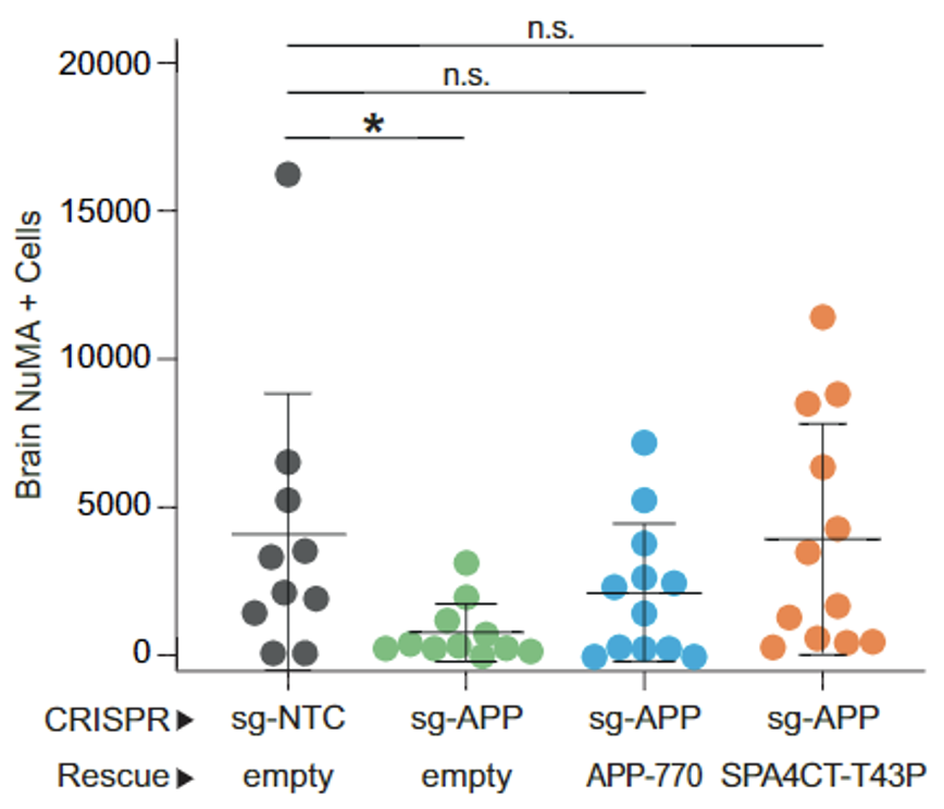 为了验证这个猜想,他们进行了回补实验。向已经敲除APP基因的黑色素瘤细胞中转入突变型APP基因——SPA4CT-T43P——这种突变体基因表达产物主要是Aβ,而不是APP的其他加工形式。结果显示,不论是回补野生型APP基因还是突变型APP基因,均能够恢复黑色素瘤细胞的脑转移能力。这说明Aβ就是黑色素瘤脑转移所需的APP形式。