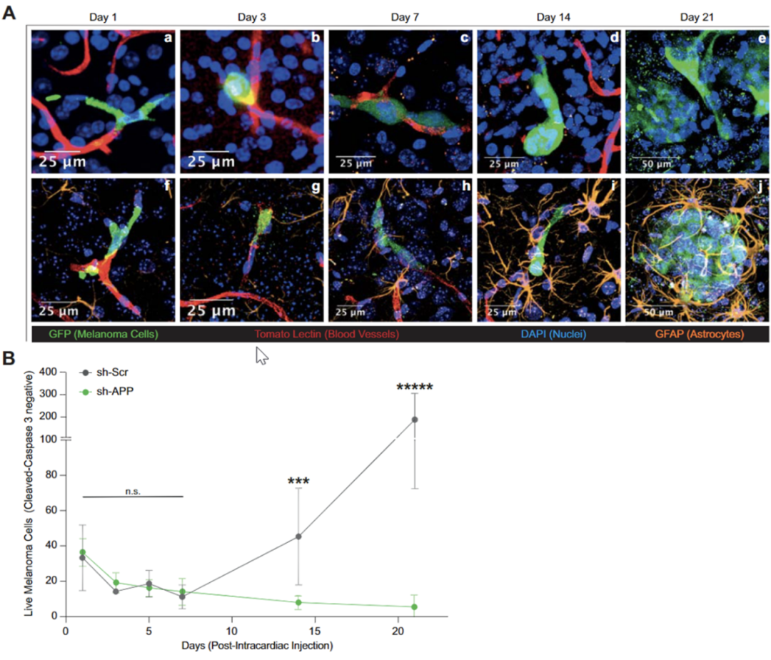 实验结果显示,敲低APP对肿瘤细胞在脑血管停滞、外渗以及在血管中生长并没有影响,但是缺乏APP的肿瘤细胞无法在脑实质中建立转移灶,而是发生了凋亡。这些数据表明黑色素瘤细胞需要Aβ帮助其在脑实质定植。
