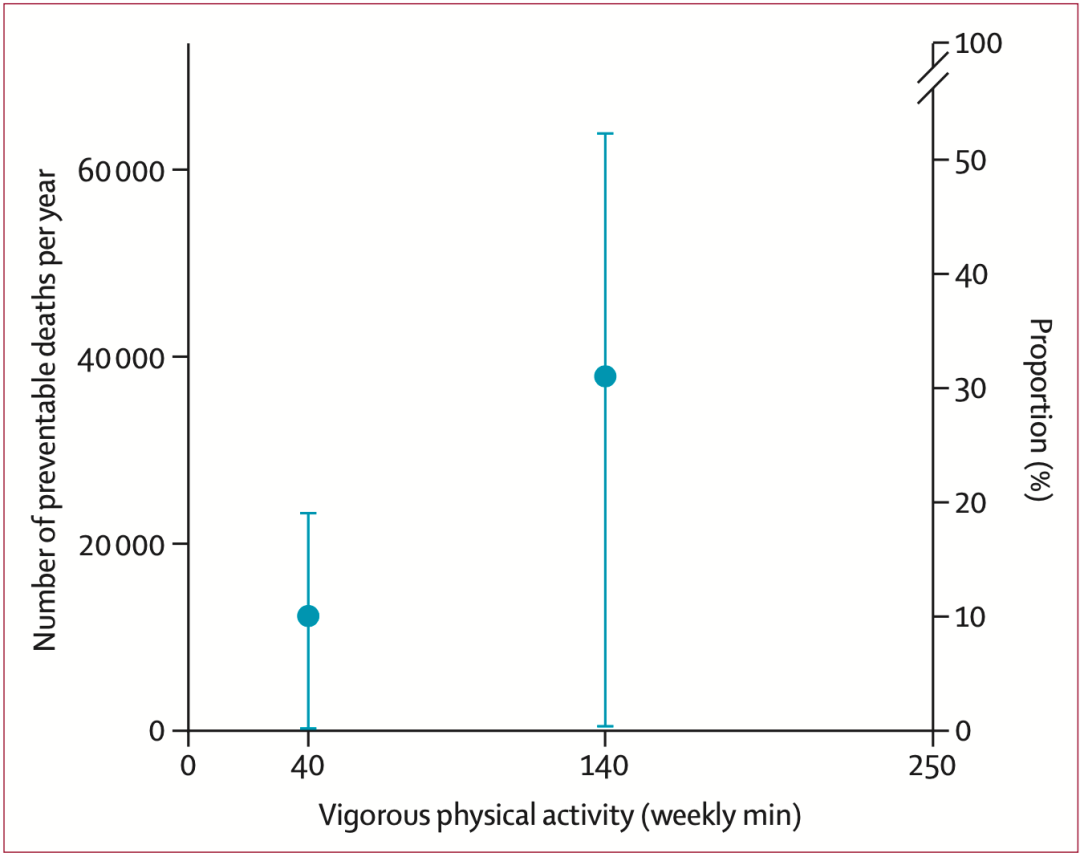 如果进一步换算成死亡人数和预期寿命延长时间的话,与每周没有VPA的人相比,每周40分钟的VPA可使美国每年因阿尔茨海默病死亡的人数减少10.1%(12238人),每周140分钟的VPA可使美国每年阿尔茨海默病相关死亡人数减少31%(37710人);这两种运动量的人预期存活时间分别延长1.6年和2.3年。