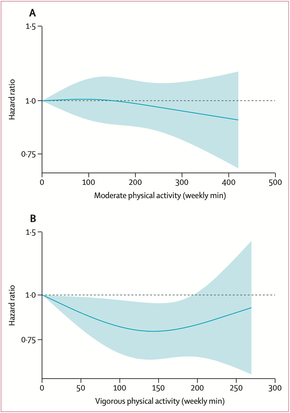 值得注意的是,这个研究也发现,过多的剧烈运动不再有保护作用。实际上,去年10月份的一项研究成果也从侧面证明了这一点。这项基于挪威7005名参与者的研究发现,与33-65岁之间始终从事低运动量工作的参与者相比,始终从事高运动量工作的参与者痴呆风险增加34%,轻度认知障碍风险增加80%,始终从事中等运动量工作的MCI风险增加36%[4]。显然,过于强烈的运动,可能有害无益。
