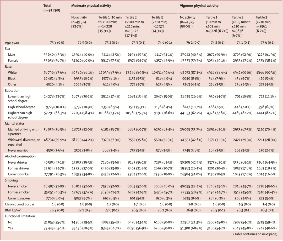 研究一共包括91298名成年人,他们的平均年龄为75.8岁,其中女性占比为56.7%,白人占比87.6%,黑人占比8.3%。随访的中位时间为6.5年。从运动情况来看,52.7%的参与者未报告任何时长的MPA,80%的参与者未报告任何时长的VPA。
