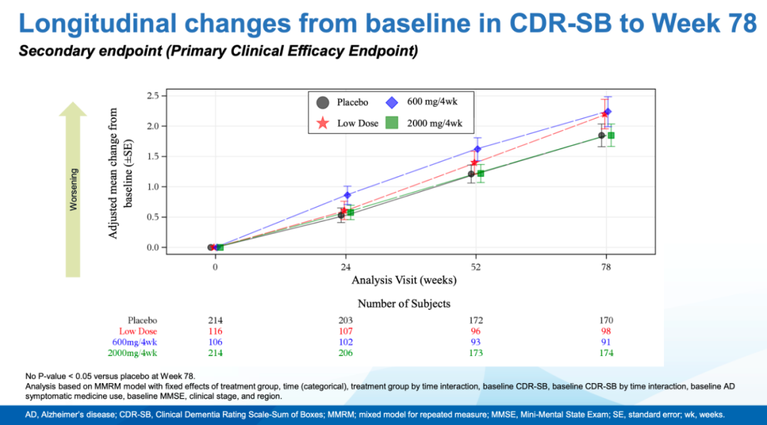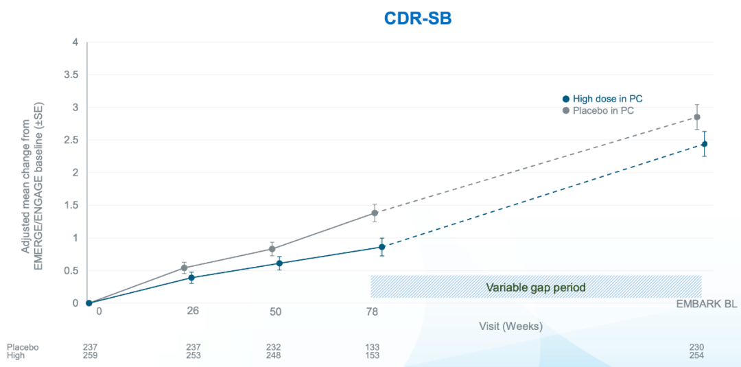 此外,在治疗间隙期,虽然疾病有所进展,但在EMERGE和ENGAGE结束时,高剂量aducanumab和安慰剂之间的临床终点数字差异维持不变。