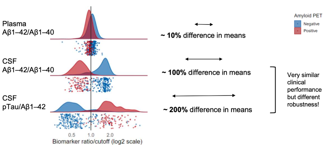 不过,基因泰克团队的研究却给开展AD临床研究的研究人员提了一个醒(LBR11),他们的研究表明:血浆Aβ42/40比率虽然是一个好指标,用来筛查AD还是不行,主要问题是区分度低,而且在这一点上它比CSF Aβ42/40的效果差太远了。或许将血浆Aβ42/40用于临床试验患者的筛选,还有很长的路要走。