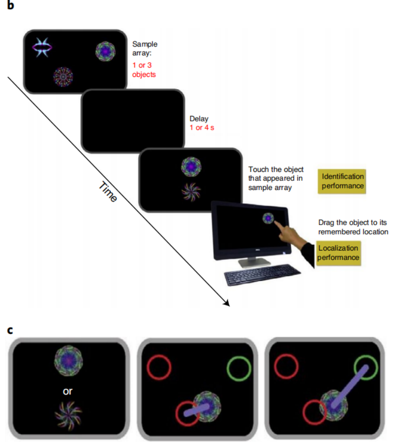 由于之前的研究都是在APOE ε4基因携带者脑内出现明显的Aβ沉积前进行的,为了探究APOE ε4在病理条件下对于认知的影响,研究人员选择了年龄在70岁以上的老年人群作为研究对象(此时Aβ的沉积已经发生),共纳入502人,将纳入的研究人群分别根据是否携带APOE ε4,以及是否Aβ阳性分组,分别对他们进行了一个名为“什么在哪里”的视觉工作记忆测试。