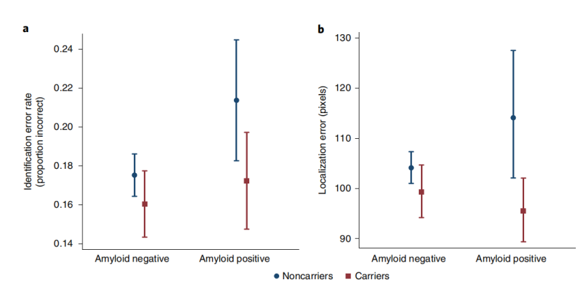 图a:被试在识别图形中的错误率,Aβ阳性组显著高于Aβ阴性组,APOE ε4携带者在两组中都有更好的表现。图b:被试在定位测试中的错误率,Aβ阳性的非携带者错误率明显增高,而Aβ阳性的携带者错误率显著降低。