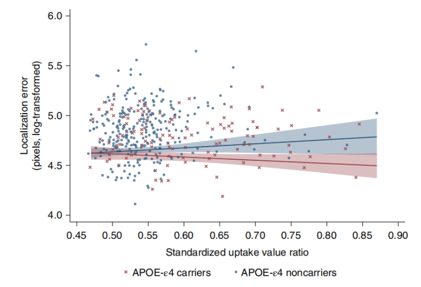 图示定位错误率和Aβ沉积的线性回归结果。可以看到APOE ε4携带使斜率显著下降。