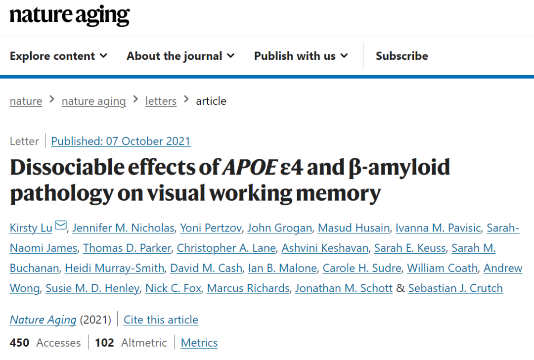 【3】 Lu, K., Nicholas, J.M., Pertzov, Y. et al. Dissociable effects of APOE ε4 and β-amyloid pathology on visual working memory. Nat Aging (2021). https://doi.org/10.1038/s43587-021-00117-4