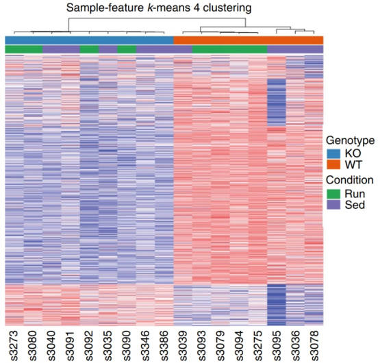 接下来,他们对小鼠海马区成年新生神经细胞进行转录组分析。主成分分析和层次聚类分析显示,无论运动干预与否,F5KO小鼠新生神经元的转录水平都出现高度异常。F5KO新生神经元与对照新生神经细胞的差异表达基因高达459个。