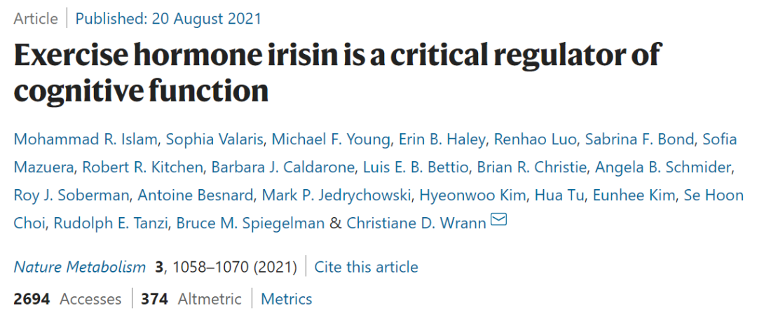 1. Islam MR, Valaris S, Young MF, et al. Exercise hormone irisin is a critical regulator of cognitive function. Nat Metab. 2021;3(8):1058-1070. doi:10.1038/s42255-021-00438-z.