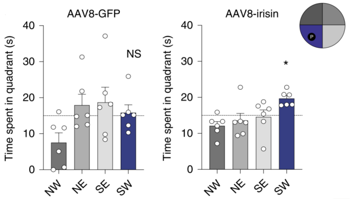 他们首先构建了FNDC5/鸢尾素(F5KO)的全敲小鼠,发现F5KO小鼠在水迷宫运动训练后,找到目标平台的时间明显长于对照组野生型小鼠,在目标象限的停留时间明显少于对照组小鼠,表明F5KO小鼠空间学习和记忆能力都出现明显下降。