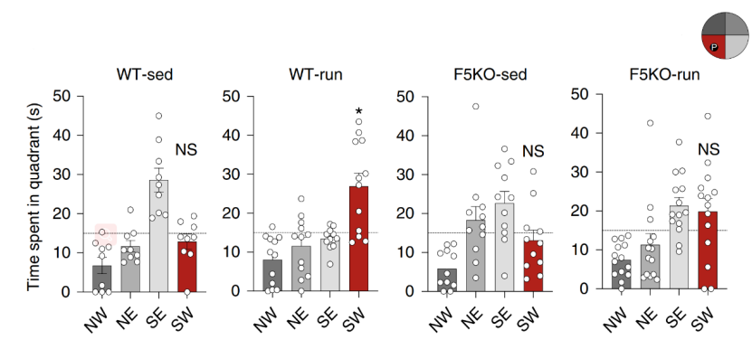 水迷宫训练后,F5KO小鼠在目标象限的停留时间明显少于对照组小鼠