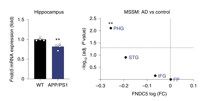 他们也对AD临床样本和AD小鼠模型进行验证,发现在2114个AD临床样本及AD转基因小鼠模型APP/PS1 (APPswe,PSEN1dE9)中,海马中FNDC5基因表达均呈明显降低。