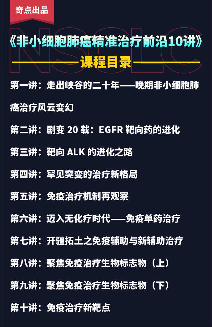 这次的课程,我们用10讲系统梳理了晚期肺癌治疗20年的风云变幻。细致盘点了靶向治疗的最新进展,也全面展现了罕见靶点研究的勃勃生机。当然免疫治疗也是重中之重,我们会带你再次洞察免疫治疗的深层机制,深入免疫治疗最前线,探讨迈入无化疗时代的治疗选择,一起见证辅助和新辅助治疗开疆拓土的战绩。除此之外,我们还会和你一起凝视纷繁复杂的生物标志物研究,探究免疫治疗新靶点的无限潜力。