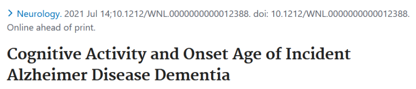 [1] Wilson RS, Wang T, Yu L, Grodstein F, Bennett DA, Boyle PA. Cognitive Activity and Onset Age of Incident Alzheimer Disease Dementia [published online ahead of print, 2021 Jul 14]. Neurology. 2021;10.1212/WNL.0000000000012388. doi:10.1212/WNL.0000000000012388.