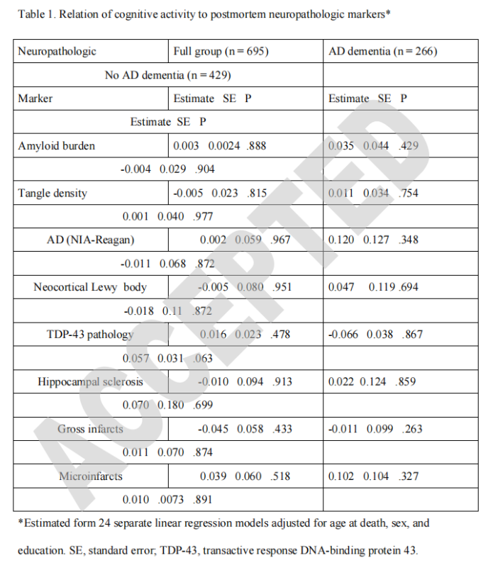 为探究两种截然相反的因果假设,研究者对695例死亡人群进行大脑组织检查和神经病理学检查。在控制了死亡年龄、性别和教育程度的基础上,对基线认知活动水平和逝世后神经病理标志物进行了回归分析。