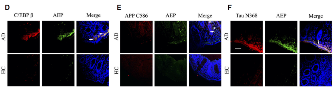 在AD患者的结肠标本中,研究者们也观察到被激活上调的C/EBPβ/AEP信号,而对照人群结肠中未检测到相关表型。不仅如此,免疫荧光染色发现AEP与APP C586片段及Tau N368片段存在共定位,说明AD患者肠道中上调的AEP是具有δ-secretase酶活性,能够对APP、Tau等AD致病蛋白进行切割。