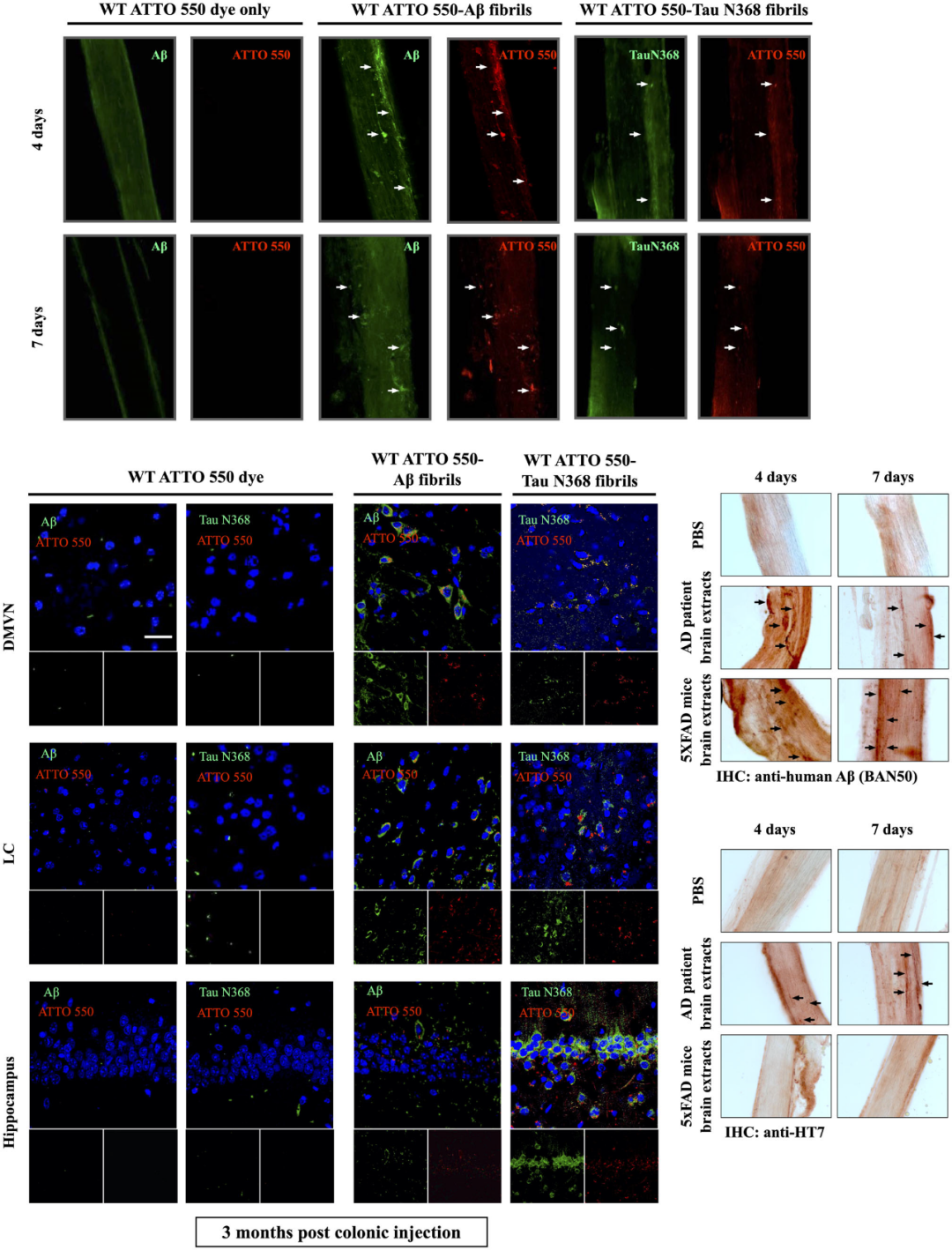 为了进一步获得肠道中Aβ、Tau等AD病理蛋白可经由迷走神经播散至脑部致病的直接证据,研究团队在体外合成了带有ATTO550红色荧光标记的Aβ1-42多肽及Tau N368片段。结肠局部注射上述致病蛋白后的4-7天,即可观察到其在迷走神经的分布;局部注射后3个月,可在多个脑区观察到荧光标记的Aβ及Tau N368。