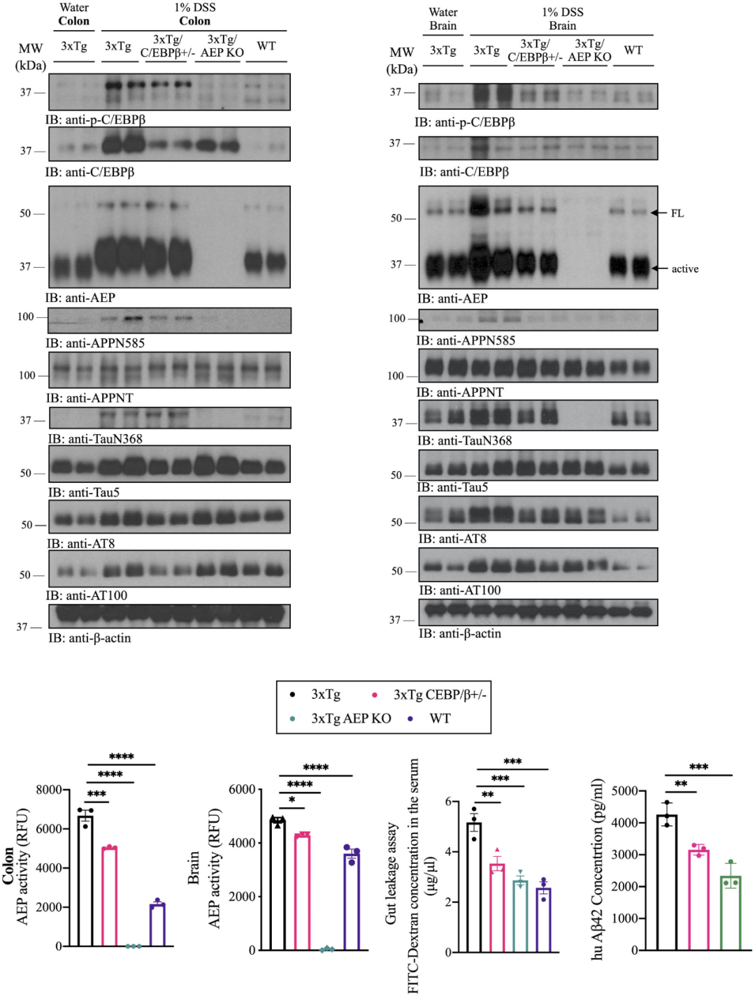 研究者用1% 硫酸葡聚糖钠盐(DSS)连续处理3×Tg AD小鼠1月,以诱导结肠损伤,引起局部炎症及增加通透性。在这一诱导肠道炎症模型中,研究者检测到肠道及脑部的p-C/EBPβ、激活态AEP、APP及Tau切割片段等均显著上调,说明肠道炎症可直接激活C/EBPβ/AEP通路,并导致AD相关神经病理改变。
