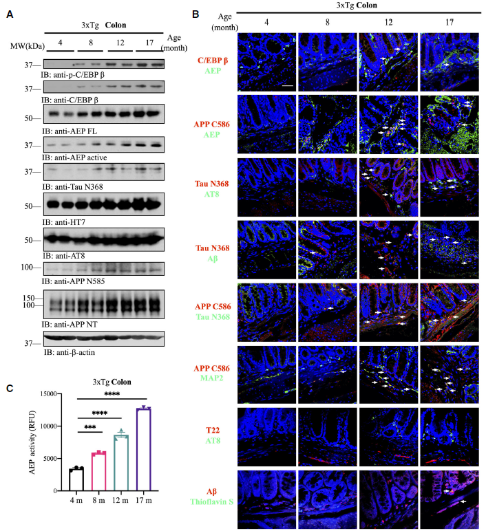 研究者首先检测了4-17个月年龄递增的3×Tg AD模型小鼠肠道中C/EBPβ/AEP通路的激活水平,发现随着AD小鼠年龄的不断增长,其肠道中C/EBPβ的磷酸化水平及AEP酶活性均上调。