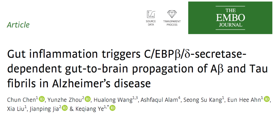 [1]Chen, C. et al. Gut inflammation triggers C/EBPbeta/delta-secretase-dependent gut-to-brain propagation of Abeta and Tau fibrils in Alzheimer's disease. EMBO J, e106320, doi:10.15252/embj.2020106320 (2021).