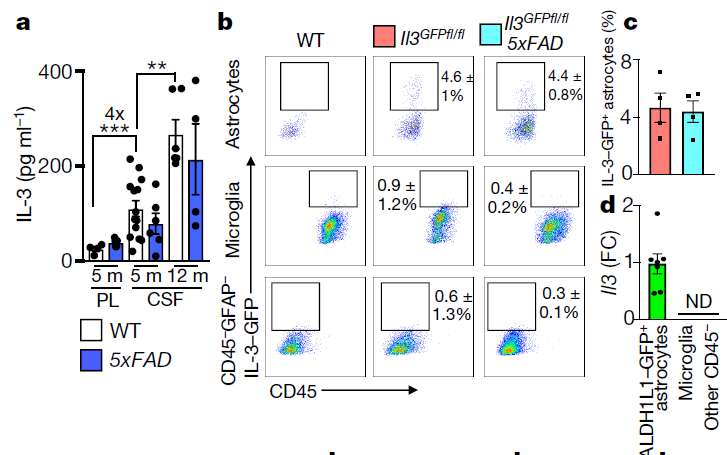 此外,通过研究IL-3的分布和来源,他们发现小鼠脑脊液的IL-3浓度高于血清,且脑脊液浓度随时间增加。与此同时,他们还发现神经系统中的IL-3主要是由一小部分星形胶质细胞生成(图2)。