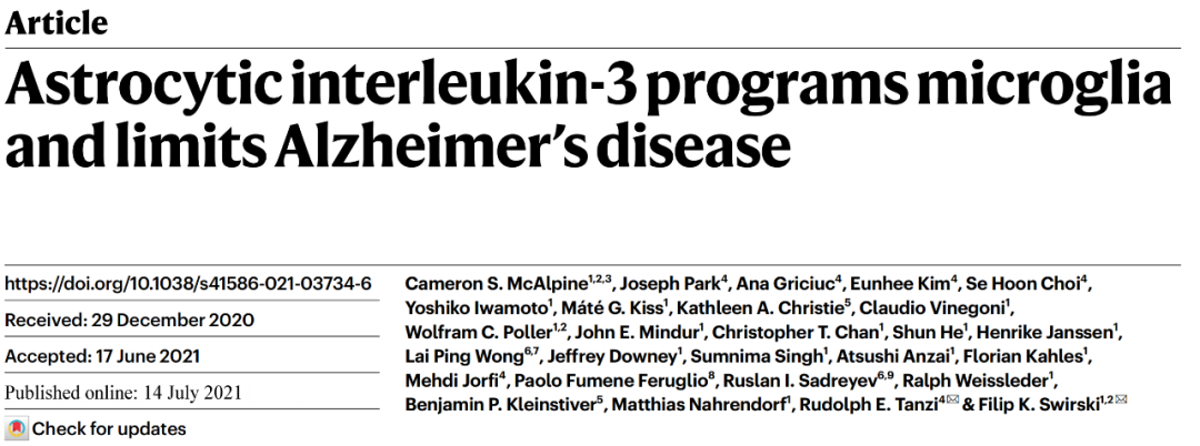 [3]McAlpine CS, Park J, Griciuc A, et al. Astrocytic interleukin-3 programs microglia and limits Alzheimer's disease. Nature. 2021. doi:10.1038/s41586-021-03734-6