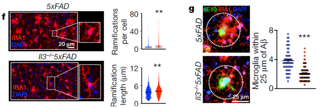 左:正常AD小鼠和Il3基因敲除AD小鼠的小胶质细胞形态对比;右:两组小胶质细胞距离β淀粉样斑块的距离对比。