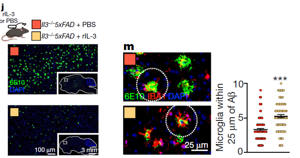结果显示,接受IL-3注射的小鼠和PBS对照组相比,皮质内β淀粉样斑块含量显著降低,小胶质细胞到β淀粉样斑块的距离更短(图5)。在记忆测试中经过IL-3注射的小鼠也有更好的表现。这一结果表明了IL-3或许能够作为治疗AD的药物。