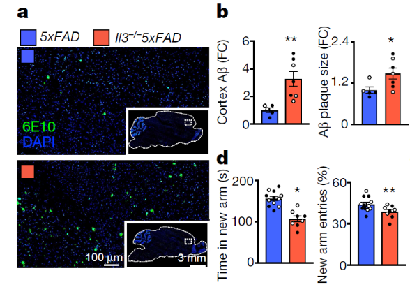 他们首先利用Il3基因敲除小鼠和FAD基因突变小鼠,得到缺乏IL-3的AD动物模型。通过对比该模型与正常FAD突变模型,他们发现IL-3缺乏时皮质内β淀粉样斑块含量升高,短期记忆和空间学习记忆明显受损,证明了IL-3对于AD的保护性作用。