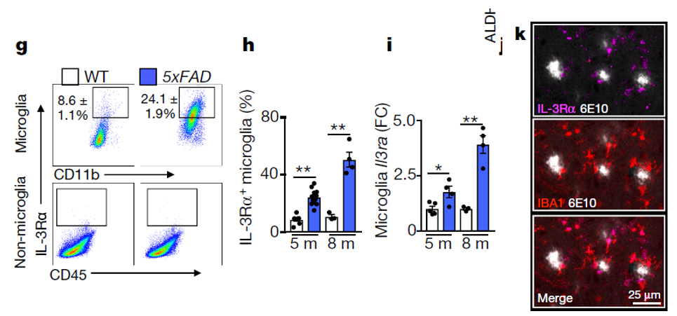 他们发现有一部分小胶质细胞表达IL-3受体(IL-3R),而且IL-3R比例在AD模型中高于野生型,且这一比例会随着时间明显增加。