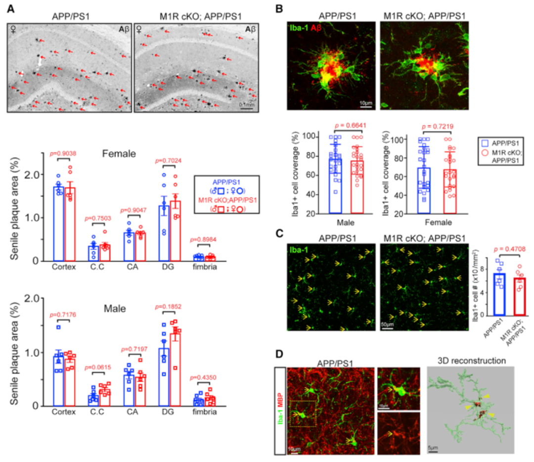 通过先前的研究发现敲除OPC中的M1R或给予氯马斯汀均可以增加APP/PS1转基因小鼠中髓鞘的再生,那么在这个过程中,AD的其他病理特征有没有受到影响呢?