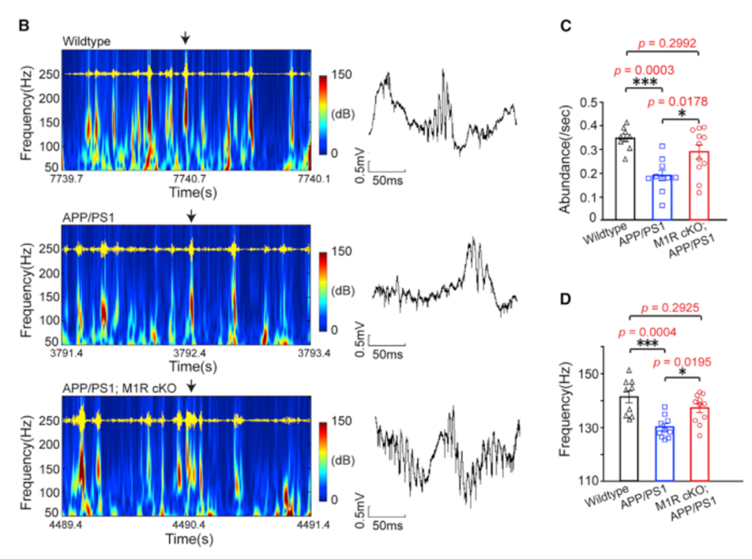 另外,与记忆巩固相关的海马尖波涟漪在APP/PS1转基因小鼠中明显减少,而敲除M1R,髓鞘再生增加后,海马尖波涟漪增加,海马电生理活动恢复,表明髓鞘再生增加可提高空间记忆巩固能力。