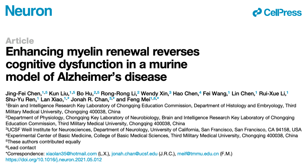 [1] Chen JF, Liu K, Hu B, et al. Enhancing myelin renewal reverses cognitive dysfunction in a murine model of Alzheimer's disease [published online ahead of print, 2021 Jun 3]. Neuron. 2021;S0896-6273(21)00352-4.
