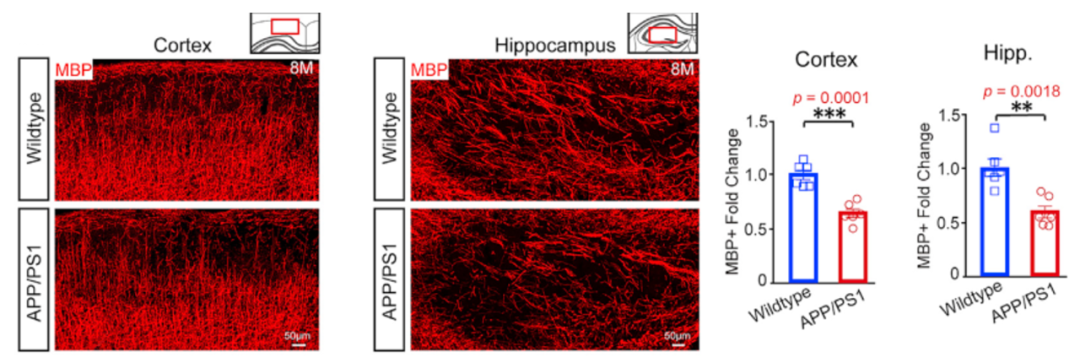 新生髓鞘的量增加,而已形成髓鞘的量减少,那么在APP/PS1转基因小鼠中,髓鞘的总体水平又是如何变化的呢?通过免疫荧光和免疫印迹的方法可发现,自8月龄开始,APP/PS1转基因小鼠的髓鞘明显减少,而OPC和轴突密度没有显著变化。为了验证AD患者中存在髓鞘减少的结论,研究人员在AD病人样本上进行了验证,结果证明AD患者皮层和海马的髓鞘均明显减少。