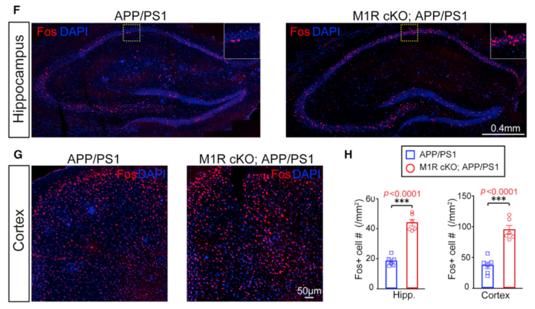 作者通过对Fos(神经元活化标志物)进行染色发现,髓鞘再生增加的APP/PS1转基因小鼠的皮层和海马中的Fos阳性细胞数目明显增加。
