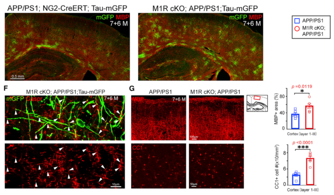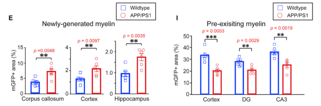 在该小鼠7月龄时给予他莫昔芬,在3个月后观察新生髓鞘的变化。令人意外的是,APP/PS1转基因小鼠的皮层,海马以及胼胝体中,新生髓鞘比野生型小鼠显著增加。